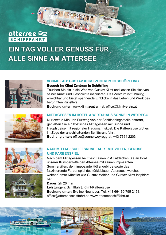 Gerne ist Ihnen unser Team bei der Planung Ihres perfekten Ausflugs behilflich. Die Möglichkeiten am Attersee sowie im gesamten Salzkammergut sind so vielseitig wie die bezaubernde Landschaft. Wählen Sie ihr Lieblingsangebot und verbringen Sie erlebnisreiche Stunden im Herzen Österreichs.
